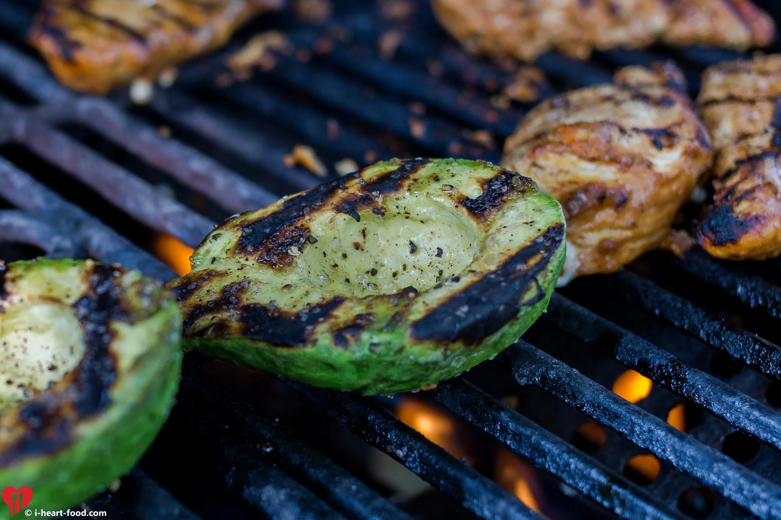 Avocado on the grill with some chicken breast.