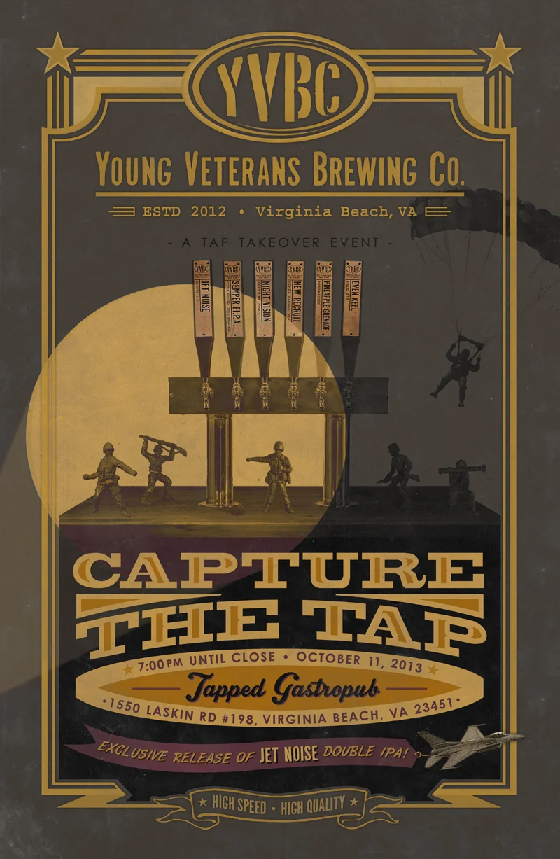Young Veterans Brewing Co. + Tapped Gastropub Tap Takeover Poster DesignJust finished having some fun with this poster design. Tapped Gastropub in Virginia Beach, VA is hosting a Tap Takeover Event, featuring Young Veterans Brewing Co. on October 11, 2013. YVBC plans to have all 6 of their signature brews on tap at Tapped, including the award winning Jet Noise Double IPA. I’ll be bringing my growler and some ear plugs…