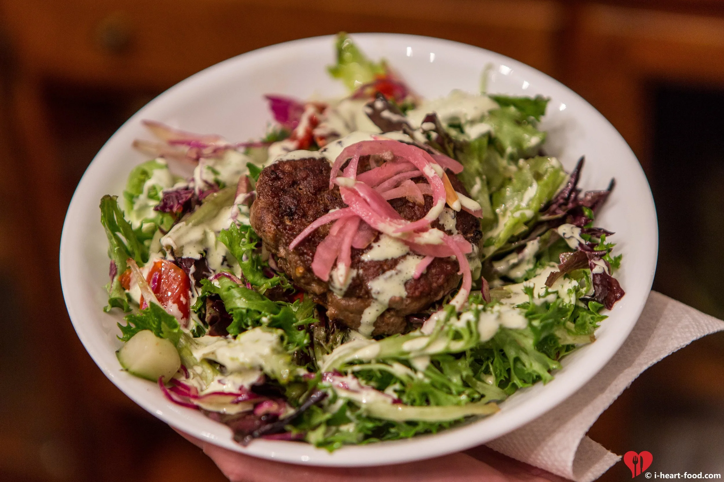 I intended on eating half of it and taking the other half home to Shelby, but I ended up eating the whole thing. I reasoned that the greens would wilt and I would buy her a fresh one soon - I did a week later ;) Take a look at the burger: