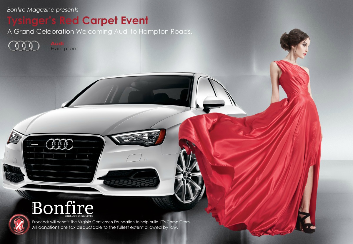 Bonfire Magazine is pleased to present Tysinger's Red Carpet Event benefiting the Virginia Gentleman Foundation’s efforts to build JT's Camp Grom. The event will be on May 8, 2014 from 6pm to 10pm and will be hosted in Tysinger's new state-of-the-art Audi Showroom at 2712 Magruder Blvd., Hampton, VA. The night will be filled with fabulous food from top local area chefs, luxurious cocktails and decadent desserts from award winning pastry chefs. Plus live music from local band, 504 Supreme.